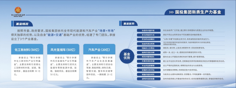 為落實(shí)我市構(gòu)筑“四個(gè)世界級(jí)產(chǎn)業(yè)”和培育戰(zhàn)略性新興產(chǎn)業(yè)的決策部署,市國投集團(tuán)于2024年開始,承接設(shè)立總規(guī)模120億元的三支產(chǎn)業(yè)基金——鄂爾多斯市化工新材料產(chǎn)業(yè)引導(dǎo)基金(總規(guī)模50億元)、風(fēng)光氫儲(chǔ)車產(chǎn)業(yè)引導(dǎo)基金(總規(guī)模50億元)和鄂爾多斯市汽車生態(tài)產(chǎn)業(yè)發(fā)展基金(總...