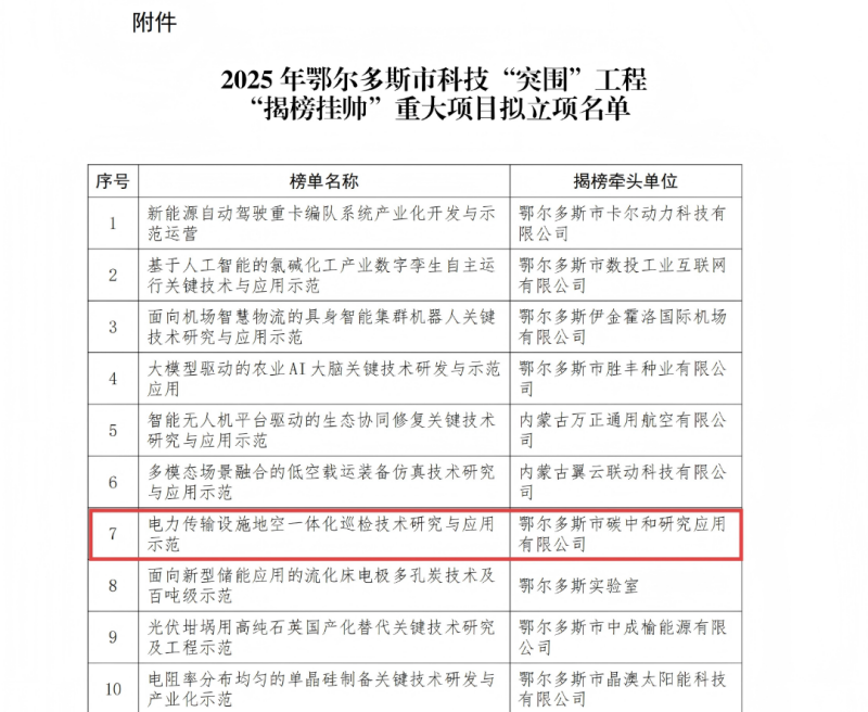 近日,鄂爾多斯市科技局公示2025年科技“突圍”工程“揭榜掛帥”重大項(xiàng)目擬立項(xiàng)名單,鄂爾多斯碳中和研究院成功揭榜《電力傳輸設(shè)施地空一體化巡檢技術(shù)研究與應(yīng)用示范》。該項(xiàng)目的實(shí)施標(biāo)志著鄂爾多斯市在新能源電站運(yùn)維領(lǐng)域有望形成新的技術(shù)突破,同時(shí),也將促進(jìn)新能源產(chǎn)業(yè)與低空經(jīng)濟(jì)的深度融合。
