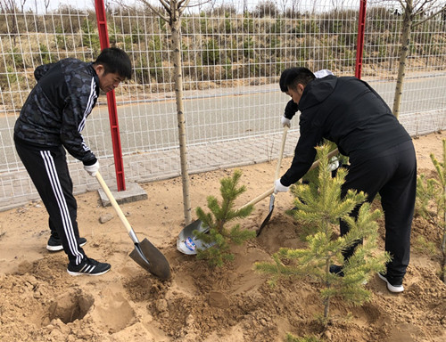 ?揭牌儀式結(jié)束后,國(guó)投青年職工們自發(fā)組隊(duì),各有分工,有的揮鋤挖土,有的扶苗填坑,有的揮鍬培土,有的夯實(shí)土層,植樹(shù)活動(dòng)如火如荼地進(jìn)行著。經(jīng)過(guò)兩個(gè)多小時(shí)的共同勞作,共栽種了近一百株松樹(shù)苗。